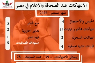 وثّق المرصد المركز العربي لحرية الإعلام (39 انتهاكا) من الانتهاكات التي أمكن رصدها خلال شهر سبتمبر المنقضى منها 4 حالات حبس احتياطي أو احتجاز مؤقت، و24 حالة تجديد ...