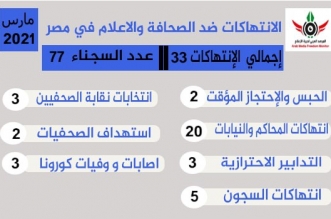وثق المرصد العربى لحرية الإعلام 33 انتهاكا للصحافة والإعلام خلال شهر مارس 2021، بينها مواصلة سيطرة الشركات التابعة للمخابرات المصرية على المنابر الإعلامية والتى كان آخرها الاستحواذ على قناة ...