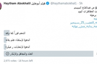 على منصة الناشط الحقوقي والإعلامي هيثم أبوخليل على "توتير" شارك المئات (3000) في استطلاع عن توقع الموقف الانقلابي من تصاعد مظاهرات جمعة الغضب. وفي الساعات الخمس الأولى من ...