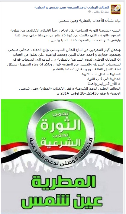 أصدر التحالف الوطني لدعم الشرعية ورفض الانقلاب العسكري بعين شمس والمطرية بيانا عقب انتهاء التظاهرات السلمية بالمطرية. قال التحالف: انتهت حشودنا الثورية السلمية بكل نجاح، وبدأ الانتقام الانقلابي ...