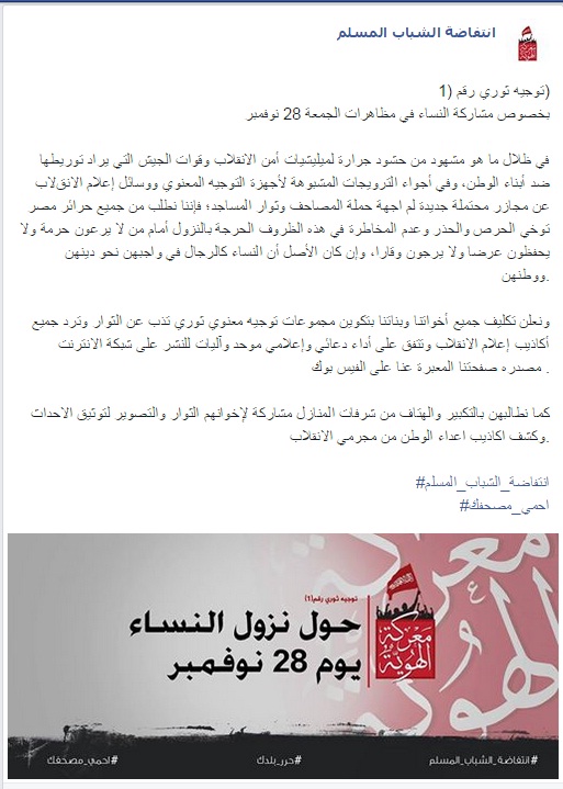 دعت الصفحة الرسمية لانتفاضة الشباب المسلم حرائر مصر إلى عدم المشاركة في مظاهرات الجمعة 28 نوفمبر. قال البيان: في ظل ما هو مشهود من حشود جرارة لمليشيات أمن ...