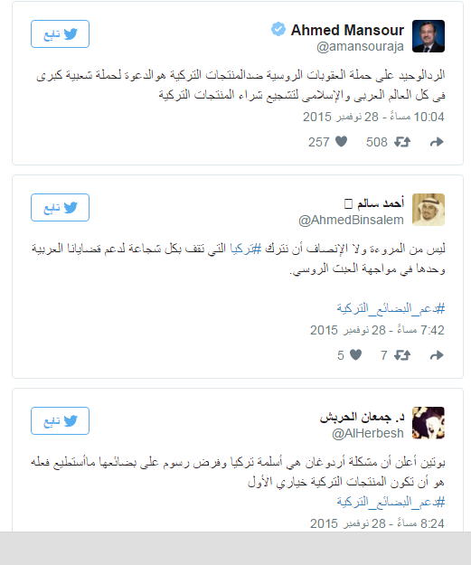 دشن نشطاء على تويتر هاشتاج #دعم_البضائع_التركية للتضامن مع تركيا بعد اتخاذ روسيا إجراءات اقتصادية انتقامية ضد أنقرة، بعد 4 أيام من إسقاط طائرة حربية روسية اخترقت الأجواء التركية ...