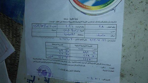 تداول نشطاء عبر صفحات فيس بوك مستندا صباح أمس صادرا من الضرائب، تخطر فيه مستأجر عقار بالمنوفية بسداد القيمة الضريبية عن عام كامل من 1 -7-2013 إلى 30-6-2014، ...