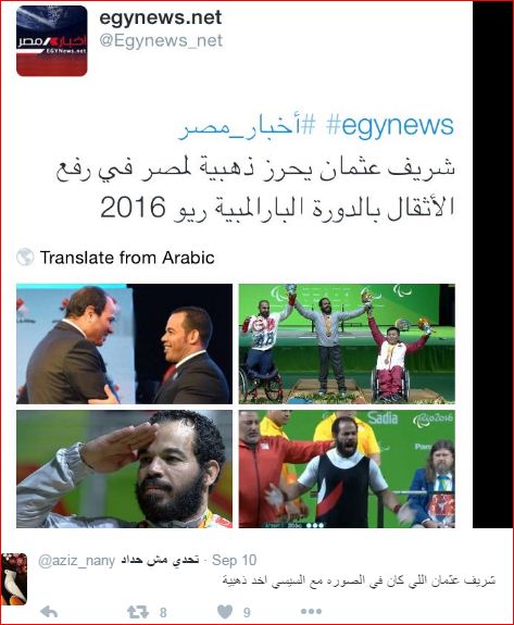 وتجتهد الأذرع في الترويج لقائد الإنقلاب بوصفه "إنسانا"، فتستغل بساطة الرياضيين الأبطال، وكان لشريف قصة قاسية قيل أنها "ابكت" عبد الفتاح السيسي وهي "انه تحول من مجرد عامل بأحد المحال الى بطل رياضي مصرى توج بأكثر من ذهبية وجعل الملايين يرددون النشيد الوطنى فى بكين وكوريا ولندن وماليزيا ودبى.. إنه شريف عثمان خليفة بطل مصرى تحدى إعاقته والظروف الخاصة، التى تعرض لها وفى مقدمتها طرده من عمله عندما علم صاحب العمل بأنه "معاق" ولا يمكنه العمل لفترات طويلة". ولأنه صاحب ذهبيات، حشده الإنقلابيون ضمن أصحاب البرونزيات الثلاث في ريو الأوليمبي، خلال تدشين "برنامج السيسي لتأهيل الشباب" منذ تسعة اشهر، وحضره، وحافظ على "الصورة" والكادر ومن يظهر ولا يظهر إلى جواره وسرد "عثمان" قصة كفاحه وتحديه لإعاقته حتى تمكن من ورفع علم مصر على منصات التتويج. وقال: بعد انتهاء كلمتى أخبرنى أحد زملائى بأن: "السيسى كاد يبكى" من قصة حياتي الصعبة، ولم تنس الصحف إضافة فخره بالدموع المزعومة!.