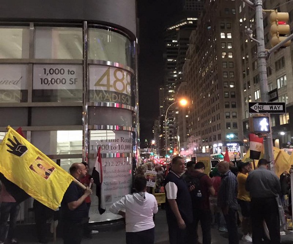 وتداول نشطاء على مواقع التواصل الاجتماعي صورًا تُظهر قيام رافضي الانقلاب بالوقوف أسفل الفندق الذي يقيم فيه عبدالفتاح السيسي بنيويورك.