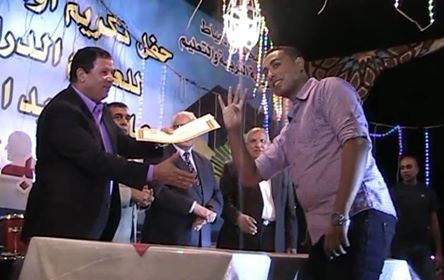 نشر الإعلامى أحمد يوسف، المصور بقناة الجزيرة مباشر مصر، صورة للطالب "عمر ياسر خروبة" الأول على محافظة دمياط في الثانوية العامة علمي رياضة وهو يرفع شارة "رابعة" فى وجه محافظ الانقلاب خلال حفل تكريم أوائل الثانوية العامة بالمحافظة.