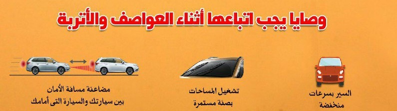 ناشد رجال المرور باتباع هذه الإرشادات أثناء التقلبات الجوية وخاصة العواصف الترابية، مؤكدين ضرورة سير المركبات بسرعات منخفضة، فضلًا عن تشغيل المساحات بشكل مستمر، وتفادى الاستخدام المفاجئ للفرامل، ومضاعفة مسافة الأمان بين السيارات.