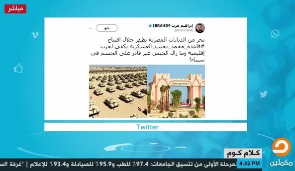 وقال إبراهيم عزب -في تغريدة عبر حسابه على موقع "تويتر"-: "بحر من الدبابات المصرية يظهر خلال افتتاح قاعدة محمد نجيب العسكرية يكفي لحرب إقليمية، وما زال الجيش غير قادر على الحسم في سيناء".