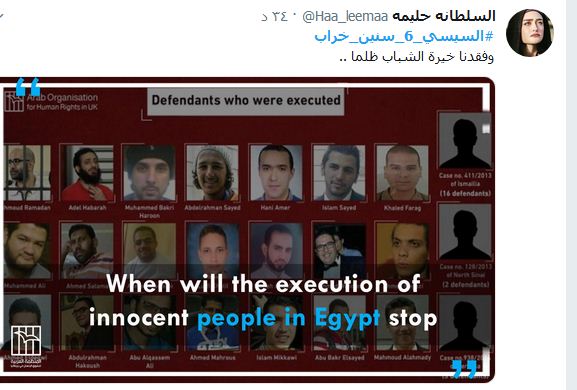 وكتبت نور الصباح: "الوطن للجيش والنيل لإثيوبيا والغاز لإسرائيل وتيران صنافير للسعودية والأهرامات للإمارات والسجن للشباب والفقر للشعب المصري". فيما كتب أبو مصعب: "النظام الانقلابي لم يترك شريفا في مصر إلا اعتقله أو سجنه أو قتله إن استطاع، وهو النظام الذي طرد أبو تريكة وعفا عن المتحرشين من اللاعبين، وهكذا نظام لا يمكن أن يقيم دولة العدل في ربوع مصر".