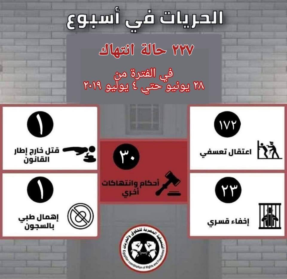 وقالت المنظمة، في بيان لها عبر صفحتها على موقع "فيس بوك"، إنها وثّقت خلال الأسبوع الماضي، منذ يوم 28 يونيو حتى 4 يوليو 2019، 227 انتهاكًا لحقوق الإنسان في مصر، تنوعت بين 172 حالة اعتقال تعسفي، و23 حالة إخفاء قسري، وحالة واحدة بالقتل خارج إطار القانون، وحالة واحدة بالإهمال الطبي بالسجون، و30 حالة محاكمات وانتهاكات أخرى.