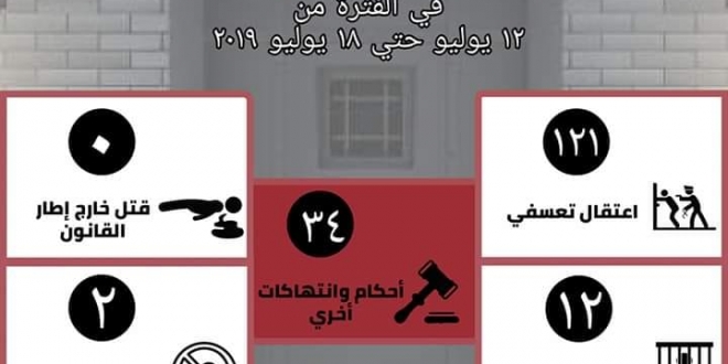 وكشفت، عبر صفحتها على “فيس بوك” أنها رصدت خلال الشهر الماضي منذ يوم 28 مايو حتى 27 يونيو 2019، نحو 589 انتهاكًا لحقوق الإنسان، تنوعت بين 266 حالة اعتقال تعسفي، و53 حالة إخفاء قسري، و25 حالة قتل خارج إطار القانون، و6 حالات من الإهمال الطبي بالسجون، و239 حالة محاكمات وانتهاكات أخرى.