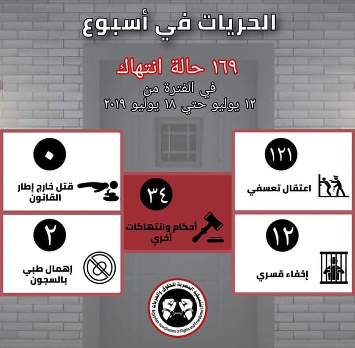 ورصدت "التنسيقية المصرية للحقوق والحريات" في حصادها الأسبوعي عن الفترة من يوم 12 يوليو حتى 18 يوليو 2019، 169 حالة انتهاك لحقوق الإنسان.