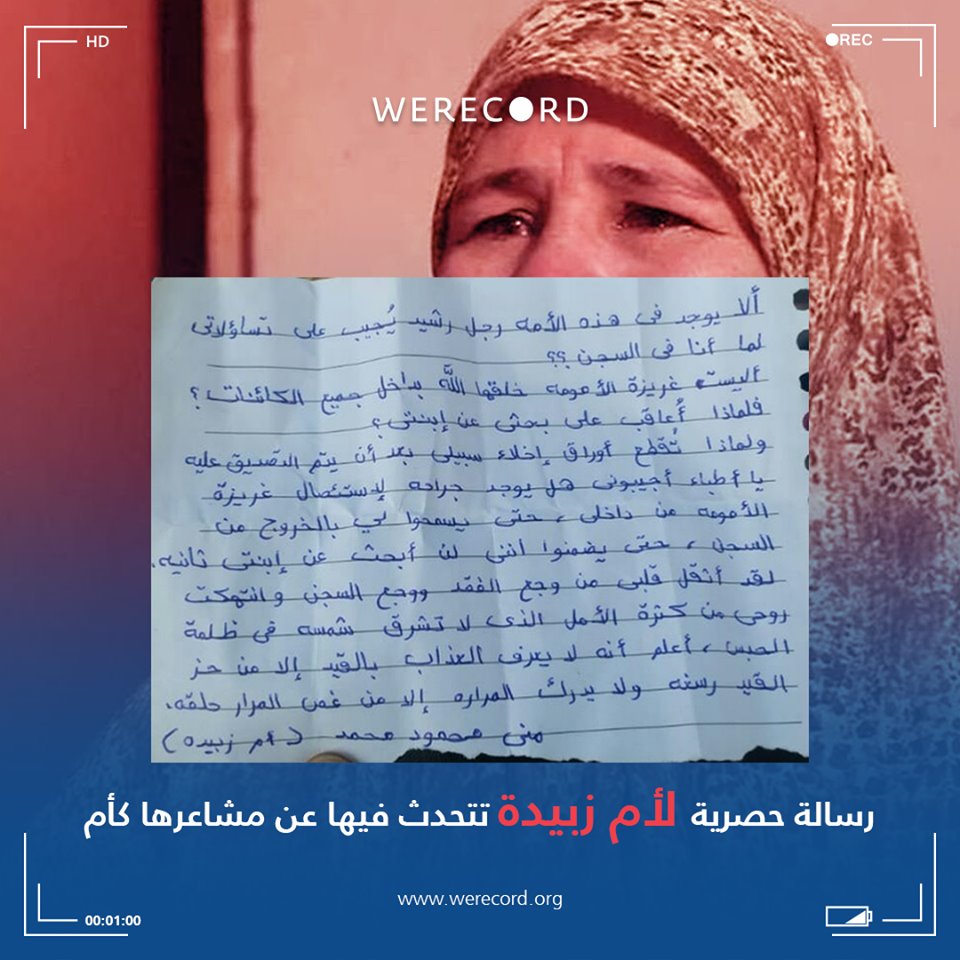 وفي رسالة بخط اليد مسربة للمعتقلة منى محمود -56 عاما- المعروفة إعلاميا بأم زبيدة، تساءلت “لماذا أنا في السجن؟ لماذا أُعاقب على بحثي عن ابنتي؟”، واعتقلت أم زبيدة في 28 فبراير 2018، على خلفية ظهورهــــا في تقـــرير تلفزيوني بثته قناة “بي بي سي” البريطانية تحت عنوان “سحق المعارضة في مصر”، اتهمت فيه أجهزة الأمن بالقبض على ابنتها وتعذيبها وإخفائها منذ أبريل2017.