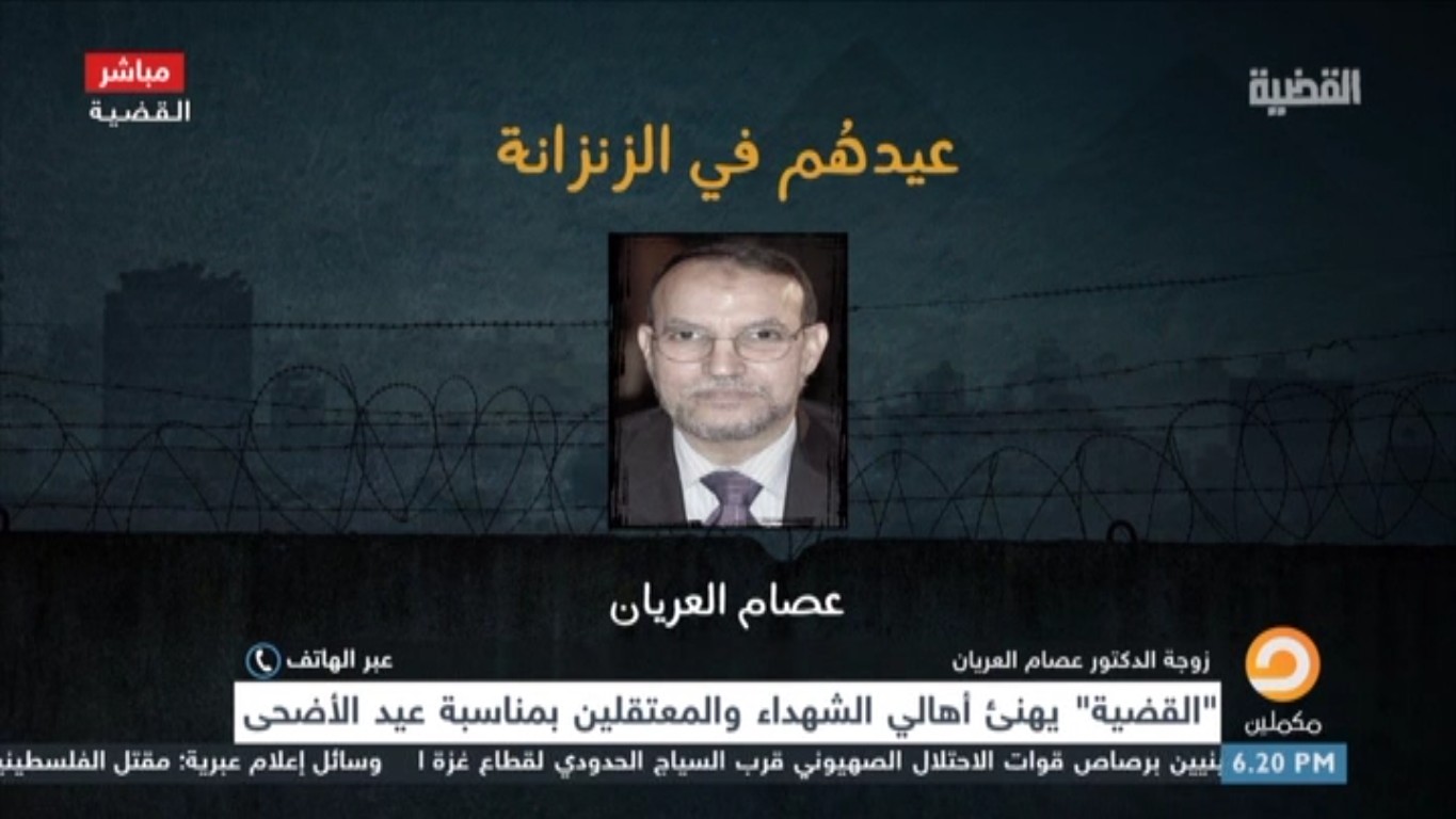 وقالت زوجة العريان إن إدارة سجن العقرب تمنع أسرته من الزيارة منذ أكثر من 3 سنوات ولا تستطيع الأسرة رؤيته إلا من خلف الحائط الزجاجي أثناء المحاكمات ويتم التواصل بالإشارة معه، مضيفة أنه يؤكد لهم باستمرار ثباته وصموده على الحق وأنهم في رعاية الله.