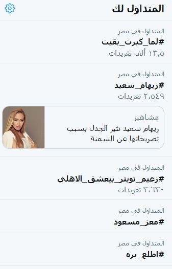تصدر هاشتاج “#ريهام_سعيد” قائمة الهشتاجات الأكثر تداولا عبر موقع تويتر، رفضا لتطاول الإعلامية الانقلابية ريهام سعيد على ذوي السمنة من المصريين، مؤكدين ضرورة التصدي لإساءات وتطاول الأذرع الإعلامية للانقلاب على الشعب المصري.