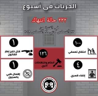 ووثّقت المنظمة، فى حصادها الأسبوعي منذ يوم 23 أغسطس حتى 29 أغسطس 2019، 232 حالة انتهاك لحقوق الإنسان في مصر، تنوعت بين 100 حالة اعتقال تعسفي، و4 حالات إخفاء قسري، وحالة واحدة من القتل خارج إطار القانون، وحالة واحدة من الإهمال الطبي بالسجون، و126 حالة محاكمات وانتهاكات أخرى .