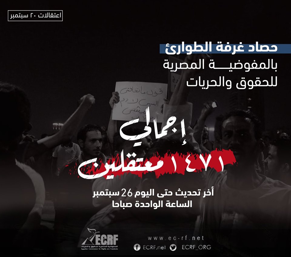 وثَّقت غرفة طوارئ المفوضية المصرية للحقوق والحريات، 1471 معتقلا (بينهم 37 متظاهرا رفضت أسرهم النشر عنهم)، منذ خروج مظاهرات 20 سبتمبر الجاري وحتى الساعات الأولى من صباح اليوم الخميس 26 سبتمبر.