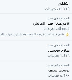 تصدر هاشتاج "#موعدنا_بعد_الماتش" موقع تويتر، بالتزامن مع استمرار المظاهرات المطالبة بإسقاط قائد الانقلاب العسكري عبد الفتاح السيسي وعصابته، وأكد المغردون استمرار المظاهرات في كافة شوارع مصر حتى استرداد مصر من يد عصابة العسكر.