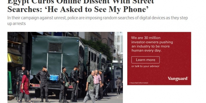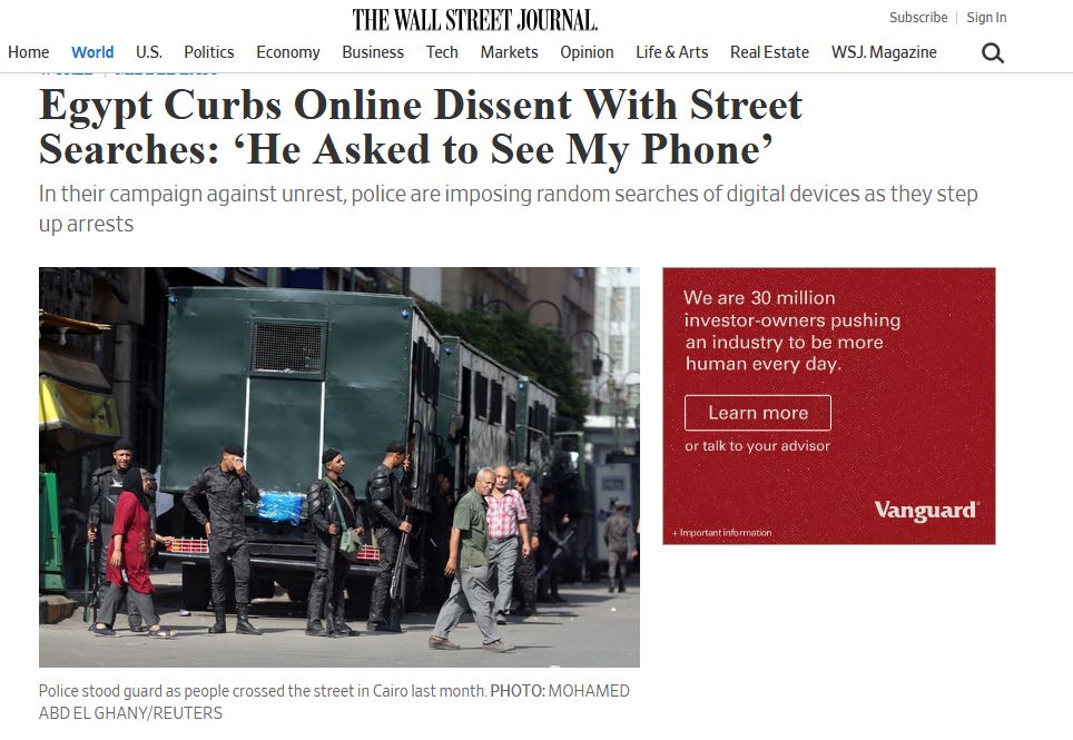 قالت صحيفة “وول ستريت جورنال”، إن مصر تمنع المعارضة على الإنترنت مع عمليات البحث في الشوارع عن هواتف المصريين، مضيفة أنها في حملتها ضد الاضطرابات، تفرض الشرطة عمليات تفتيش عشوائية لأجهزة الهواتف الحديثة بينما تُصعّد الاعتقالات.