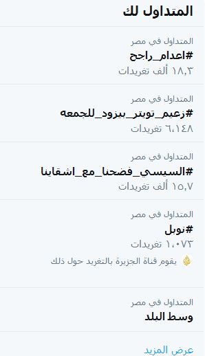 تصدر هشتاج "#السيسي_فضحنا_مع_أشقائنا" موقع "تويتر"، بالتزامن مع الجرائم التي يرتكبها نظام الانقلاب بحق رعايا الدول الشقيقة، وفشله في إدارة أزمة "سد النهضة" مع الجانب الإثيوبي، وأكد المغردون ضرورة التوحد والتخلص من عصابة العسكر وإنقاذ مصر من الانهيار.