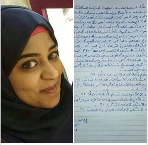 وتساءلت: "بأي ذنب تضيع أحلامي ويجحد بي وطني!! بأي ذنب تحتمل أمي ما لا يطاق وتعاني ما تعانيه وهي لم تدخر جهدًا في تربيتي وتعليمي لنكافأ في آخر الأمر بالانتظار في طوابير الزيارات لمدة خمس سنوات!!".