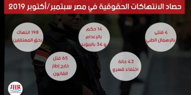 رصدت منظمة عدالة لحقوق الإنسان، في حصادها عن الانتهاكات التي ارتكبتها عصابة العسكر في مصر خلال شهري سبتمبر وأكتوبر 2019، نحو 4688 انتهاكًا.