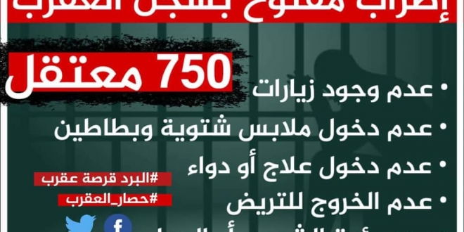 لليوم الثالث على التوالي يستمر إضراب معتقلي سجن العقرب عن الطعام بشكل كامل، على الرغم من بطونهم الخاوية وأجسادهم المنهكة نتيجة ظروف الاحتجاز المأساوية والتي تتنافى مع أدنى معايير حقوق الإنسان.