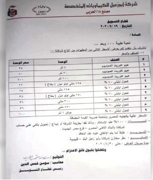 ونشر موقع “العربي الجديد” خطابًا موجهًا، بتاريخ 19 أبريل 2020 من قطاع التسويق بشركة “أبو زعبل للكيماويات المتخصصة”، التابعة لوزارة الدولة للإنتاج الحربي في حكومة الانقلاب، إلى شركات التوزيع الراغبة في الحصول على منتجات الشركة من المعقمات، ومحددة فيه أعلى أسعار للبيع من قرار حكومة الانقلاب بنسبة تزيد على 80%.