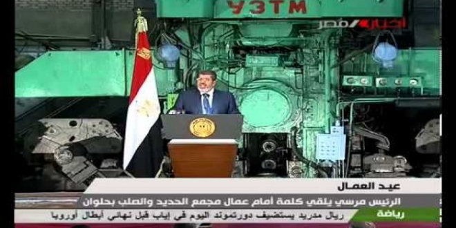 وتابع مرسي “نحن نمر الآن بالعبور الثالث، كما قلت سابقًا: العبور الأول كان في أكتوبر المجيد، والثاني في ثورة 25 يناير، والثالث هو عبور الإنتاج، اليوم نحتفل بالعمال وفي ذات الوقت أصحاب العمل أيضًا، ونحيي القطاع العام والخاص بكل ما فيه”، مشيرًا إلى زيارته لمجمع الحديد والصلب في حلوان الذي بدأت لبناته الأولى في القرن الماضي”.