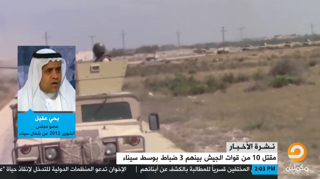 قال يحيى عقيل، عضو مجلس الشورى الشرعي عن محافظة شمال سيناء: إن مقتل عشرة من قوات الجيش بسيناء يدحض مزاعم قائد الانقلاب العسكري عبدالفتاح السيسي، حول سيطرة قوات الجيش على الأوضاع بالمحافظة.