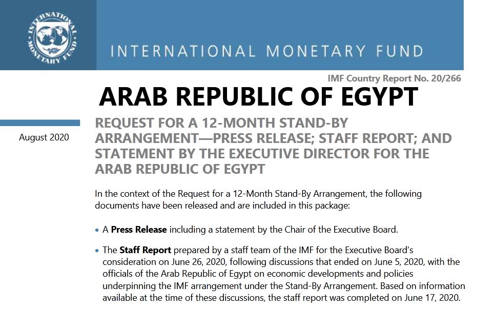 وفي مقدمة التقرير قال إن "جمهورية مصر العربية طلبت ملخصًا تنفيذيًا للترتيب القياسي لقرض مدته 12 شهرًا يواجه استقرار الاقتصاد الكلي، الذي تحقق بشق الأنفس في مصر خلال الترتيب الذي استمر لثلاث سنوات في إطار تسهيل الصندوق الممدد (EFF) وأنه يواجه الآن اضطرابًا كبيرًا بسبب جائحة COVID-19"، بحسب التقرير.
