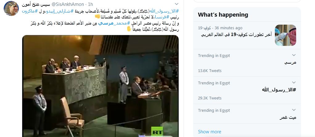 تصدر اليوم الخميس في مصر ثلاثة هاشتاجات تكاد مرتبطة ببعضها البعض، الأول #إلا_رسول_الله و"مرسي" وولليوم السادس على التوالي، هاشتاج #مش_عاوزينك_ياسيسي وزاد النشطاء على أسباب رفضهم المنقلب فوق أنه صرح باستعداده للتخلي عن السلطة حال رفض الشعب وجوده، الإساءة التي تعمد صديقه ماكرون توجيهها للرسول صلى الله عليه وسلم من خلال إعادة صحيفة "شارلي إيبدو" الرسوم المسيئة للنبي محمد صلى الله عليه وسلم.