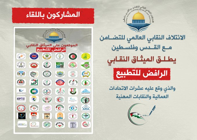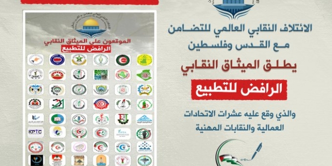 وقّع عشرات الاتحادات العمالية والنقابات المهنية، ممثلين عن ملايين العمال والنقابيين في العالم، على "الميثاق النقابي الرافض للتطبيع"، بحضور أمين منبر الأقصى الشيخ عكرمة صبري، ضمن حملة توقيع بدأت الأربعاء نظمها الائتلاف النقابي العالمي للتضامن مع القدس وفلسطين تحت شعار #نقابيون_ضد_التطبيع.