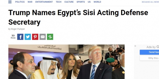 تحت عنوان "ترامب يعين السيسي وزير دفاع بالإنابة" سخرت صحيفة "ميدإيست بيست" الأمريكية من تغييرات أجراها الرئيس الأمريكي وعايرته بالدكتاتوريات الصديقة له في العالم.