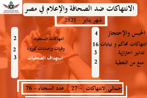 وأشار التقرير إلى أن مصر، التي تقبع في المرتبة 166 في التصنيف العالمي لحرية الصحافة، قامت بـ 27 انتهاكا خلال يناير الماضي، على رأسها جاء انتهاكات المحاكم والنيابات بـ(16) انتهاكا، ثم الحبس والاحتجاز المؤقت بـ(4) انتهاكات، والتدابير الاحترازية بـ(3) انتهاكات، واستهداف الصحفيات بـ(3) انتهاكات، وانتهاكات السجون بانتهاكين، وتساوى معها المنع من التغطية بانتهاكين.