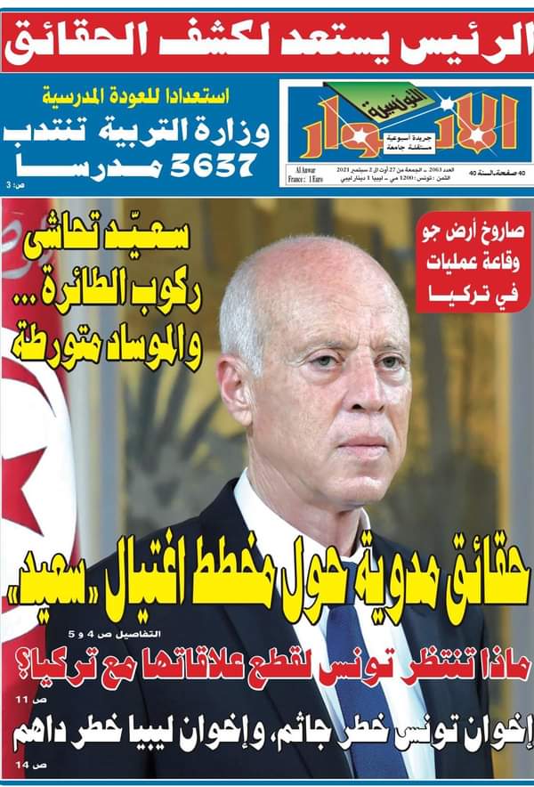 فيما يشبه الهذيان أو أفلام الغرب الخيالية، نشرت جريدة الأنوار التونسية 27 أغسطس 2021 فيلما خياليا زعمت أنه تحقيق صحفي يكشف أن "الرئيس قيس سعيد نجا من مخطط لاغتياله تورطت فيه إسرائيل وتركيا و وجماعات إخوانية في ليبيا وتونس".