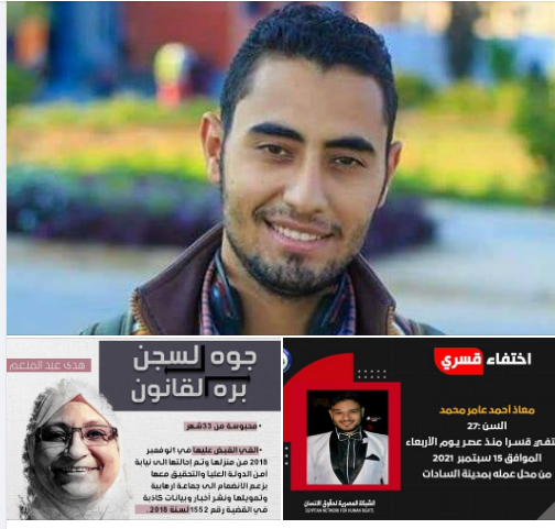 كما تواصل قوات الانقلاب بالمنوفية إخفاء الشاب معاذ أحمد عامر محمد منذ اعتقاله بتاريخ 15 سبتمبر المنقضي 2021 من محل عمله بمدينة السادات واقتياده لجهة غير معلومة حتى الآن. ووثقت الشبكة المصرية لحقوق الإنسان الواقعه حيث أكدها شهود العيان من الأهالي وسجلتها كاميرات المراقبة بمحل عمله والتي عادت قوات الأمن واستولت على "الهارديسك" الخاص بها!