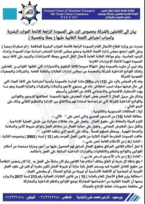 وأشارت لجنة الدفاع عن الحريات النقابية وحقوق العمل في اجتماعها الأسبوعي الثلاثاء 18يناير إلى أن لائحة الموارد البشرية للائحة قطاع الأعمال العام هي إصرار من هشام توفيق، الوزير بحكومة الانقلاب علي مخالفة قانون العمل 12لسنة 2003 وقانون التامين الاجتماعي 148لسنة 2019م.