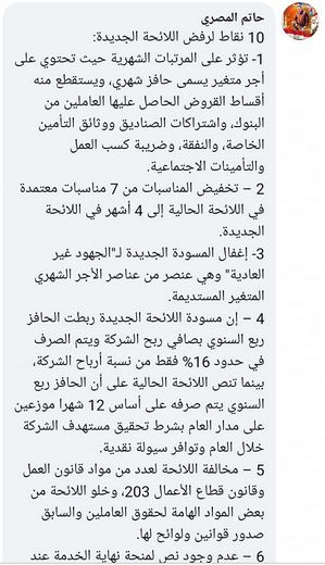ومن جانبها، قالت منظمة دار الخدمات النقابية و العمالية في بيان عبر صفحتها على فيسبوك إن "تطبيق لائحة الموارد البشرية علي الشركات افتئات على القانون وضرر بالغ بالقطاع وعماله".