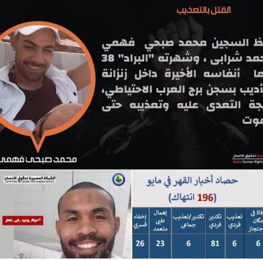 قالت منظمة نجدة لحقوق الإنسان إن "السجين محمد صبحي فهمي محمد شرابي وشهرته "البراد" 38 عاما لفظ أنفاسه الأخيرة داخل زنزانة التأديب بسجن برج العرب الاحتياطي، نتيجة التعدي عليه وتعذيبه حتى الموت، ليتم نقله بعدها جثة هامدة إلى مشرحة كوم الدكة بالإسكندرية، دون إعلام أسرته بوفاته إلا بعد 4 أيام من الوفاة في 31 مايو 2022 بالمخالفة للائحة تنظيم السجون ومواد الدستور و القانون ".