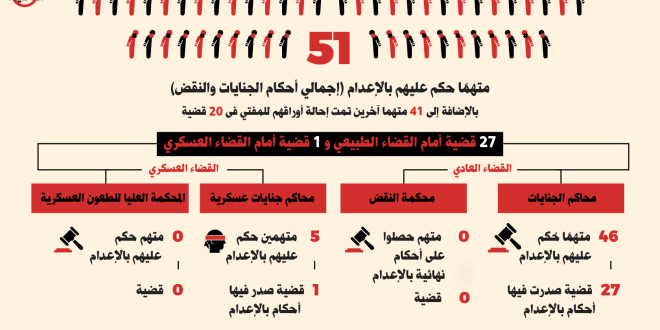 وذكرت أن أحكام الإعدام صدرت من محكمة الجنايات في 27 قضية وشملت 46 شخصا ، يضاف إليهم 5 آخرين صدر ضدهم حكم بالإعدام من محكمة عسكرية في قضية واحدة ، كما تم تنفيذ حكم الإعدام في شخص واحد بإحدى القضايا.