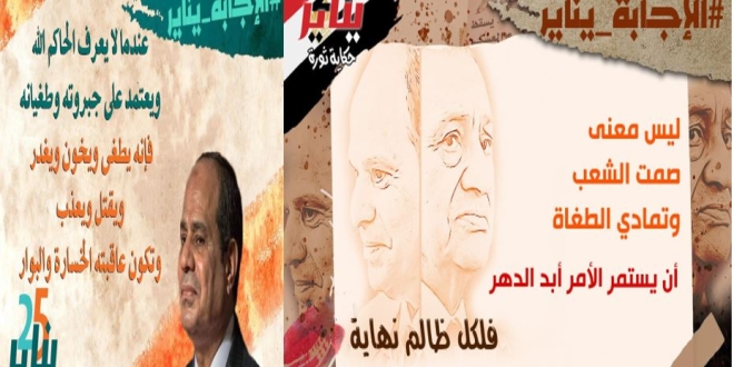 أطلق ناشطون هاشتاج الإجابة_يناير ليتصدر موقع التواصل الاجتماعي للتغريدات "تويتر" أمام هجمة السيسي على ثورة يناير وادعاء أنها أرادت إسقاط الجيش والشرطة.