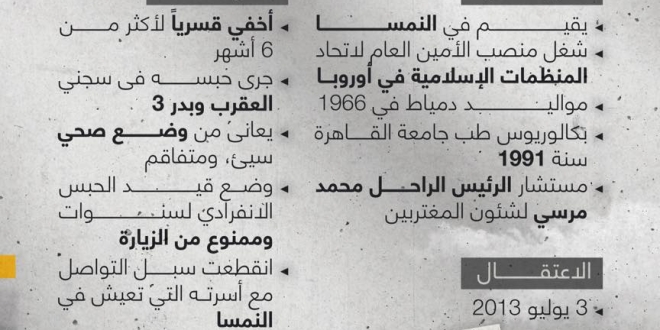 وأشارت إلى أنه عقب اعتقاله تعرض للإخفاء القسري لعدة شهور، حيث أكدت أسرته في ديسمبر2013 أنه لازال قيد الاعتقال القسري منذ 3 يوليو وحتى اللحظة، ونفت وجوده خارج البلاد، كما ادعت بعض وسائل إعلام السلطة، وبعدها بعدة أسابيع ظهر في النيابة، وجرى حبسه في سجن العقرب.