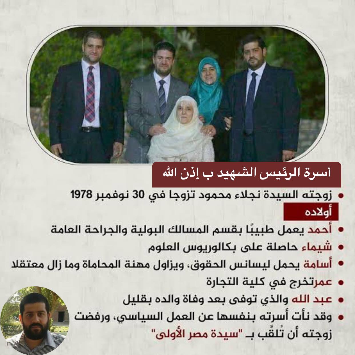 واستكمل: "أخي الأوسط أسامة في العقرب ١ ثم بدر ٣ منذ ما يقرب ٧ أعوام ولم تره عينيْ أيٍ منا أفراد أسرته.. بعيدا عن إدراج أمي و ورثة أبي علي قوائم الإرهاب و وائم التحفظ على الأموال وقوائم مصادرة الممتلكات وقوائم المنع من السفر وتجديد القوائم حتى بعد وفاته.. نحن لها لأنكم لا تدركون قوة أصحاب القضية وأصحاب العقيدة ولا شيم الرجال".