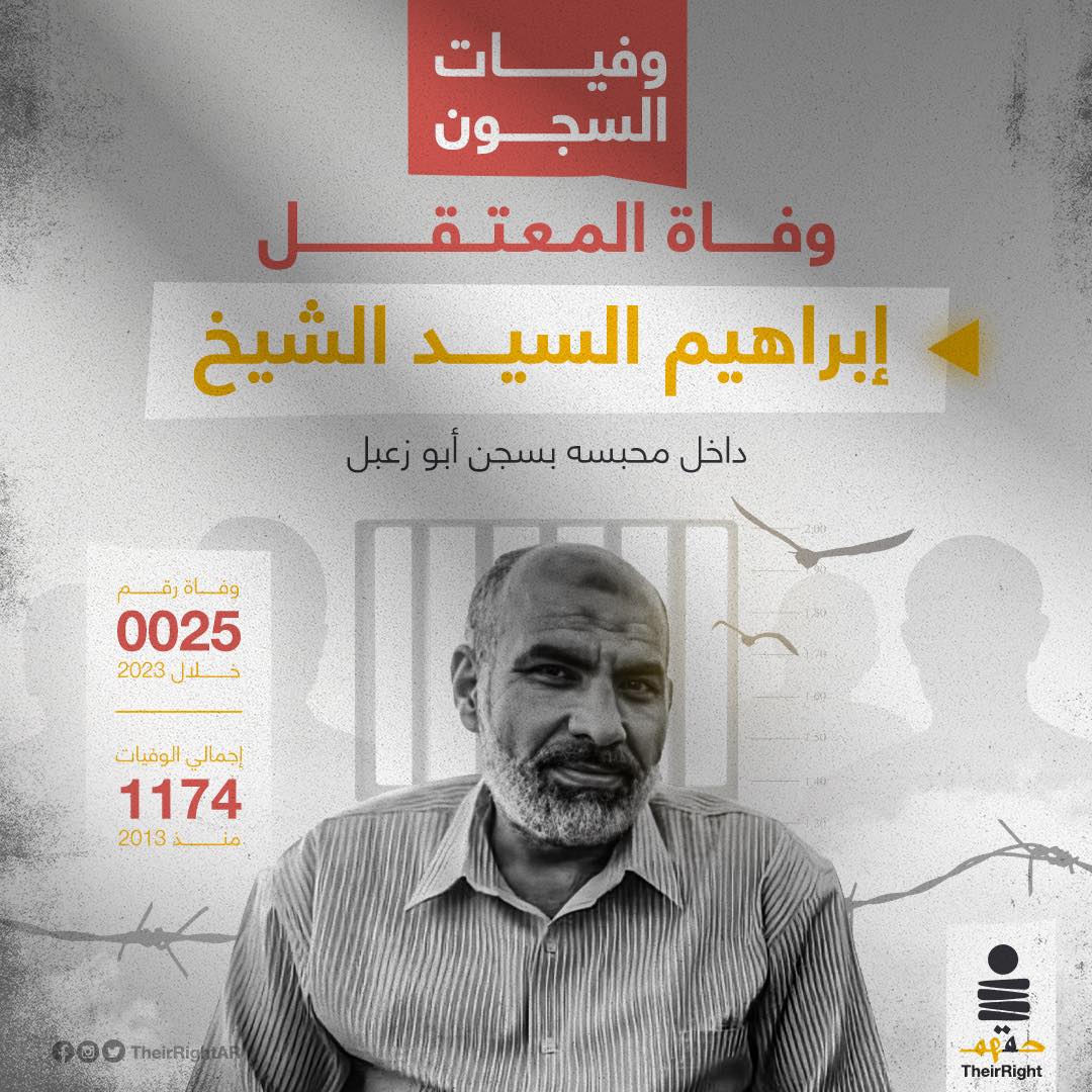 ارتقى المعتقل الدكتور “إبراهيم السيد عبدالمطلب الشيخ” شهيدا عن عمر- 56 عاما – داخل محبسه بسجن أبو زعبل، ولم يعلم حتى الآن أسباب وملابسات الوفاة بحسب ما ذكرته عدد من المنظمات الحقوقية