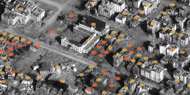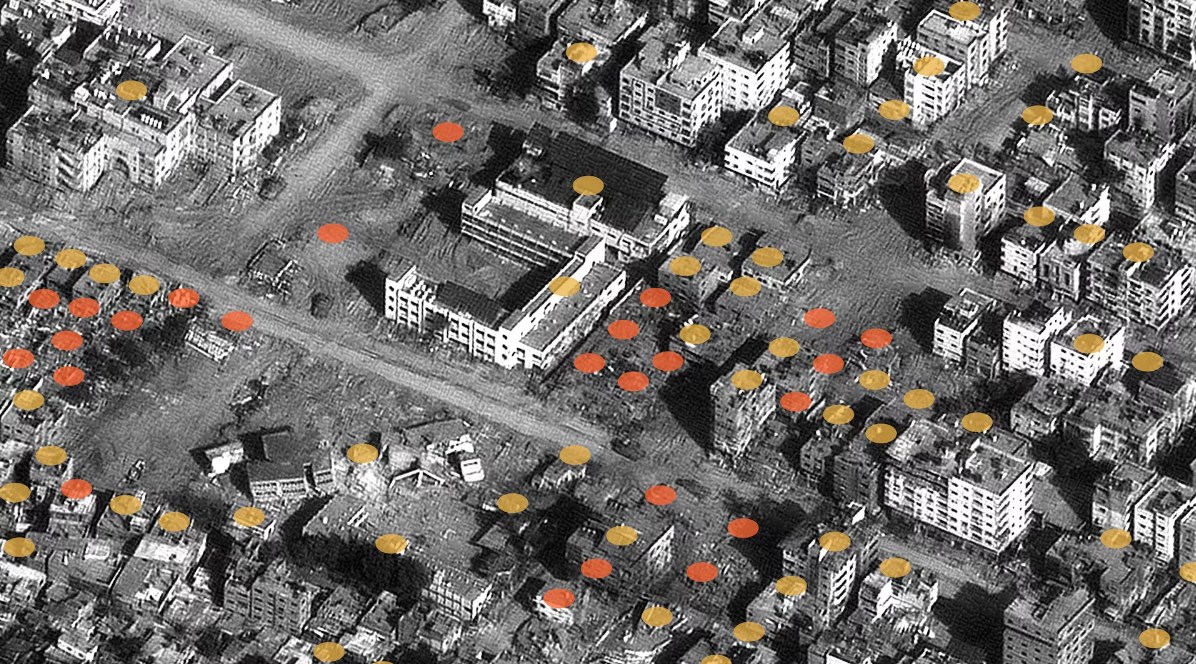 هذا هو قطاع غزة. تمثل كل نقطة هيكلا تالفا أو مدمرا ، والغالبية العظمى منها عبارة عن مباني. منذ بداية الحرب في 7 أكتوبر إلى 26 نوفمبر ، تاريخ أحدث البيانات المتاحة ، تضرر 37379 مبنى.