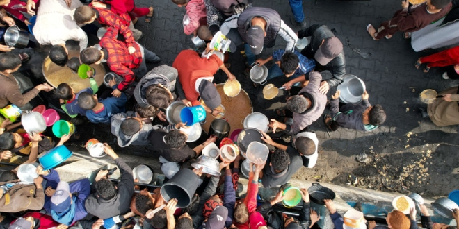 Palestinians gather to receive food cooked by a charity kitchen, amid the ongoing conflict between Israel and the Palestinian Islamist group Hamas, in Rafah in the southern Gaza Strip December 17, 2023. REUTERS/Shadi Tabatibi