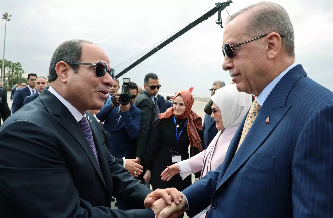 واستقبل السيسي أردوغان لدى خروجه من طائرته في القاهرة مع زوجته وتحدثا بينما كانا يسيران على السجادة الحمراء وسط ضجة كبيرة، حسبما أظهرت لقطات تلفزيونية مباشرة.
