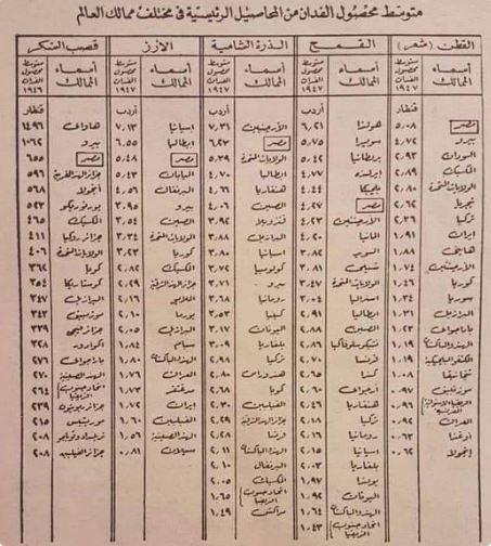 تدوال ناشطون على مواقع التواصل جدولا نادرا تم نشره في جريدة الأهرام عام 1947، كان محور مقارنات بين مصر اليوم وقبل 77 عاما، بحسب ما أظهر الجدول، وكيف أن مصر احتلت المرتبة الأولى على العالم في زراعة القطن، والمرتبة الثالثة في زراعة الأرز وقصب السكر، والمرتبة الثانية في زراعة الذرة الشامية، والمرتبة السادسة في زراعة القمح”.