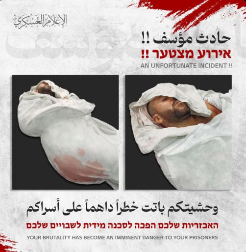 وقال أبو عبيدة في تغردية عبر التليجرام إن “المجند المكلف بحراسة أحد أسرى العدو تصرف بشكل انتقامي بعد تلقيه خبر استشهاد طفليه في إحدى مجازر العدو في غزة”.